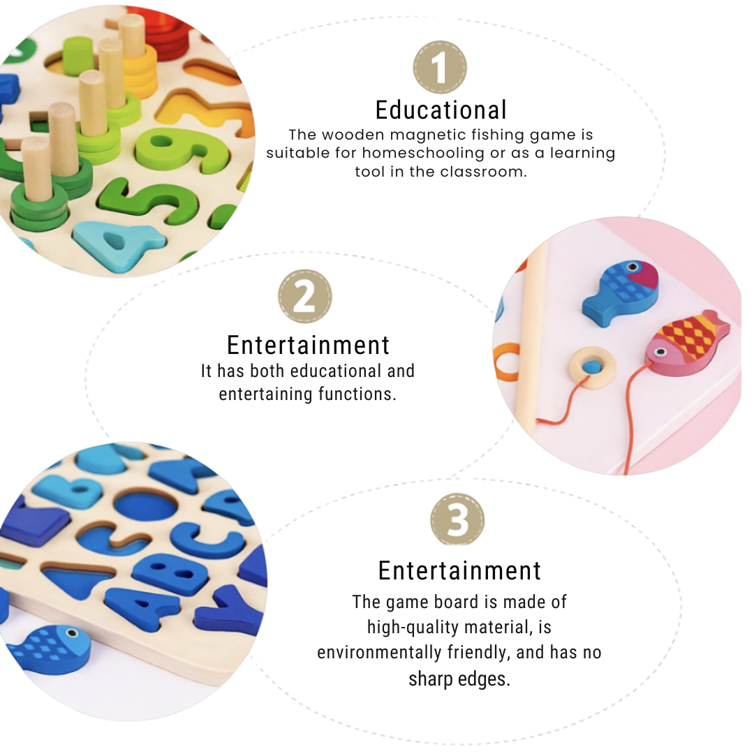 Helps little learners practice counting, sorting, matching, fishing, and early math—all in one versatile wooden board.